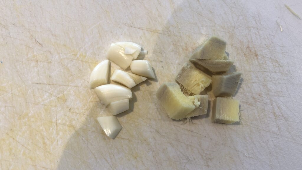 - Knoblauch und Ingwer rüsten und in Stücke schneiden