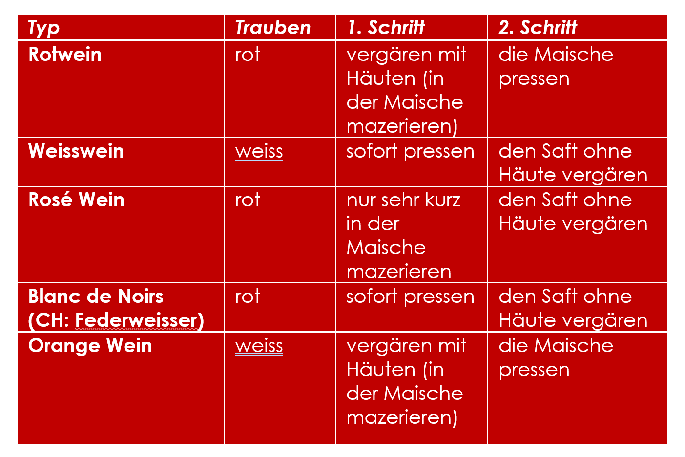 Die folgende Tabelle zeigt die Herstellungsmethoden verschiedener Wein-Typen: